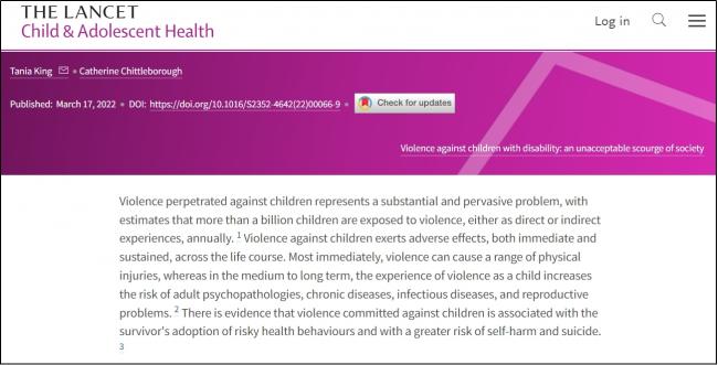 3月22日,《柳叶刀》在官方微信发布消息称,《柳叶刀-儿童青少年健康》(The Lancet Child & Adolescent Health)近日发表的研究表明,全球约三分之一的残障儿童与青少年遭受过暴力侵害,他们遭受各种形式的暴力(躯体暴力、精神暴力、性暴力和忽视)的可能性是非残障儿童与青少年的两倍。