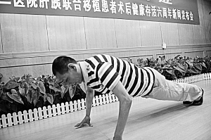 曾在湖南湘雅二院接受肝胰联合移植的姚先生今年迎来重生六周年。该例患者是目前亚洲联合移值存活最长者。图为患者姚先生做俯卧撑。