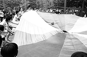 在儿童生长发育最旺盛的少年时期,练习打网球不仅可以强健体魄,还能增强儿童竞争力。图为在中网球童选拔赛上,球童玩网球体验游戏。