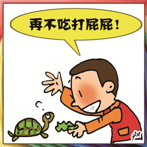 小宝不爱吃饭,于是少不了对他威逼利诱,他便习以为常,喂小乌龟时,他居然也说:“不吃饭就打屁屁!”